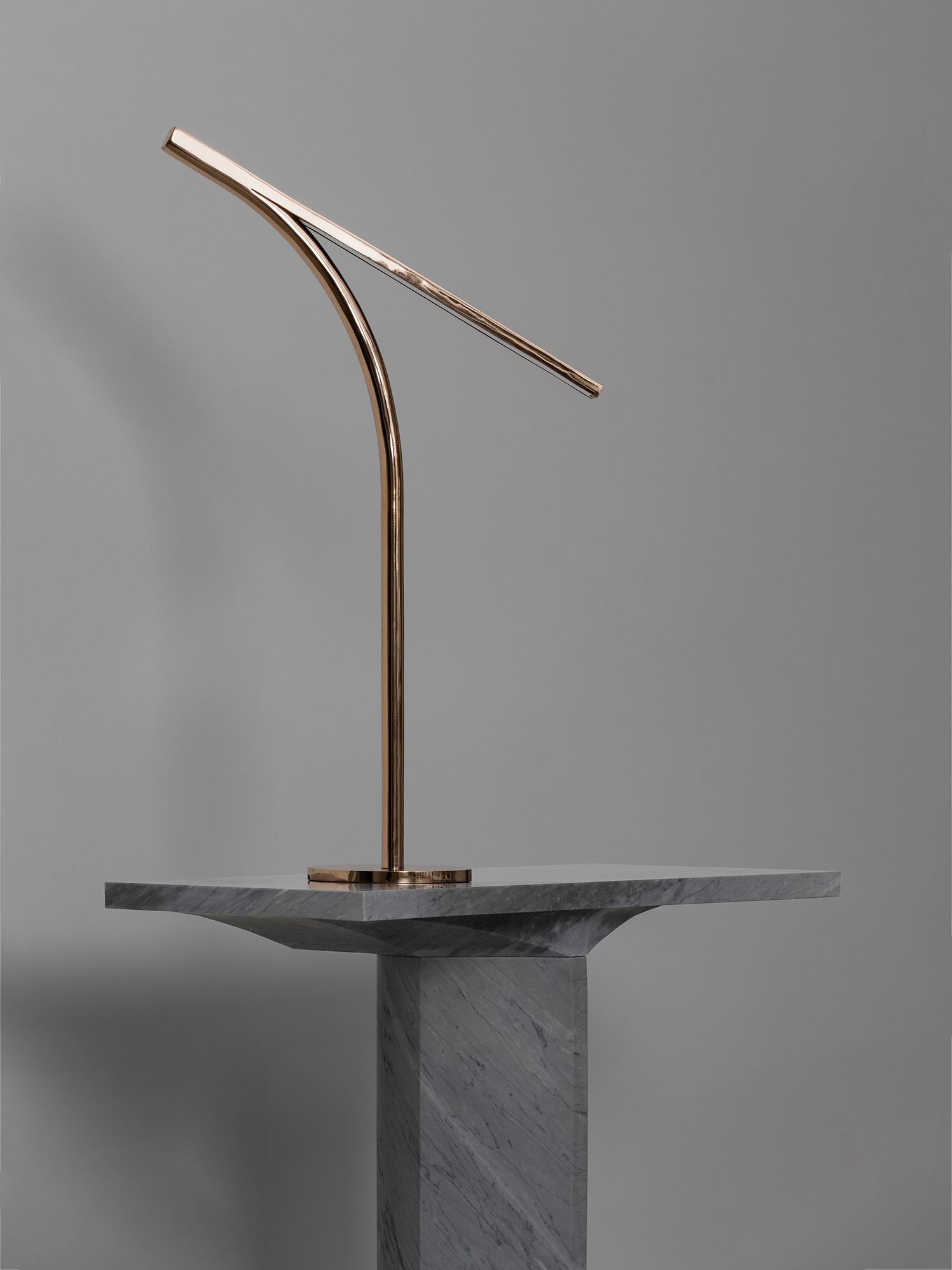 The lighting effect results from the light source’s reflection on the bent, lustrous surface of its support, which gradually becomes more diffuse as the distance between the two elements increases.